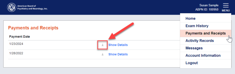 Your receipts can be found in your ABPN Physician Portal.